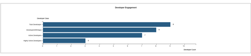 The Developer Activity dashboard provides insights into the API traffic generated by your registered app developers. It enables you to identify the developers who generate the highest API traffic volume and encounter the most errors. By utilizing this dashboard, you can proactively address any issues by identifying specific developers whose apps generate a significant number of errors compared to others, allowing you to take proactive measures to resolve the problem.