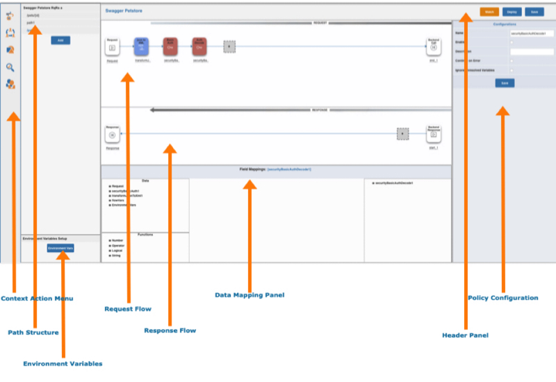 The part below the Response Flow is DataMapping panel. This is used to get data from various sources such as request,environment variable, flow variables and other policies in the flow path and set asinput to further policies with or without processing with expressions and availablefunctions.
