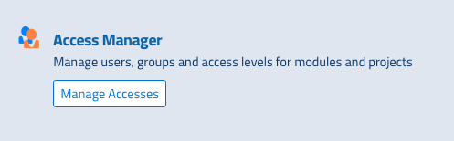 Users are created by an administrator within Access Manager. To create new user, the administrator can log into the platform and select “Access Manager” component.